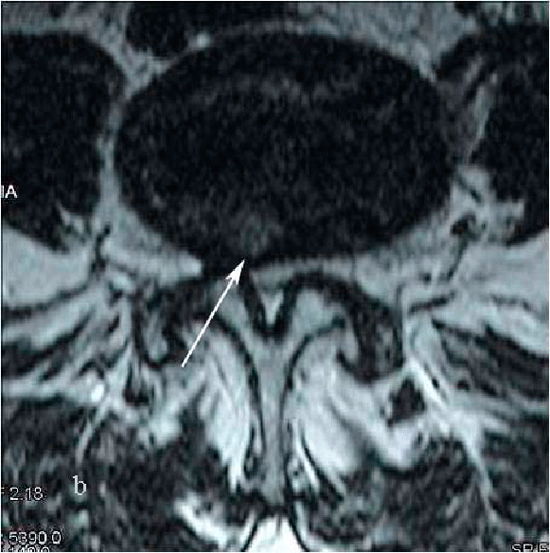 | Рис.7. Магнитно-резонансная томография (МРТ) поясничного отдела позвоночника в аксиальной проекции. Стрелкой показана мп секвестрированная парамедианная грыжа диска L4-L5 слева на фоне стеноза позвоночного канала. |