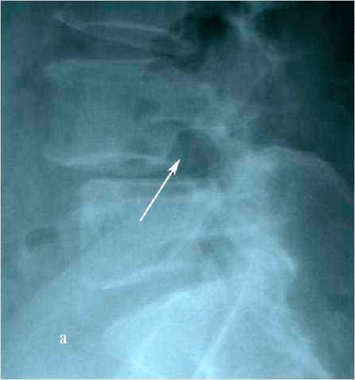 | Рис. 8а,b. Рентгенограмма поясничного отдела позвоночника в боковой (а) и прямой (b) проекциях до операции. Стрелкой показано смещение тела L4 позвонка кпереди. |