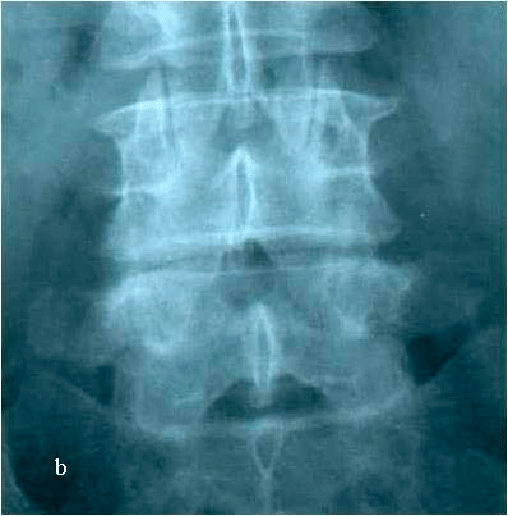 | Рис. 9 a,b. Ренгенограмма поясничного отдела позвоночника в боковой (a) и прямой (b) проекции. Транспедикулярная фиксация L4-L5 позвонков титановой конструкцией, удалена дужка L4 позвонка. |