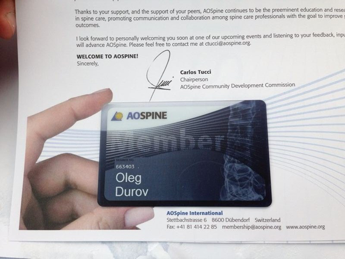 На практической части курса были освоены современные миниинвазивные методы лечения травмы позвоночника. По окончании обучения Дуров О.В. был принят в члены международного сообщества "АОSpine".