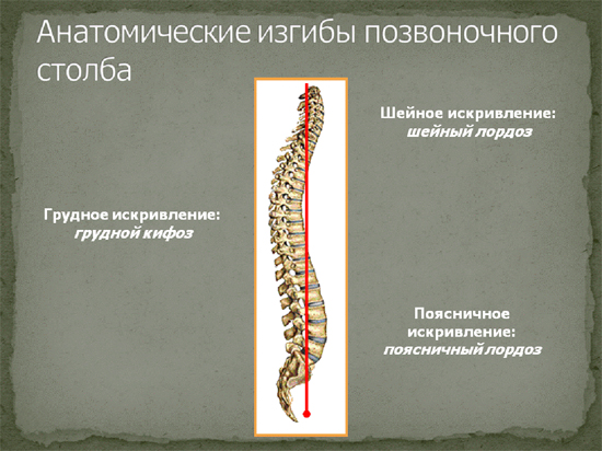 Рис. 1. Анатомические изгибы позвоночника. Изгиб кпереди лордоз, кзади кифоз.